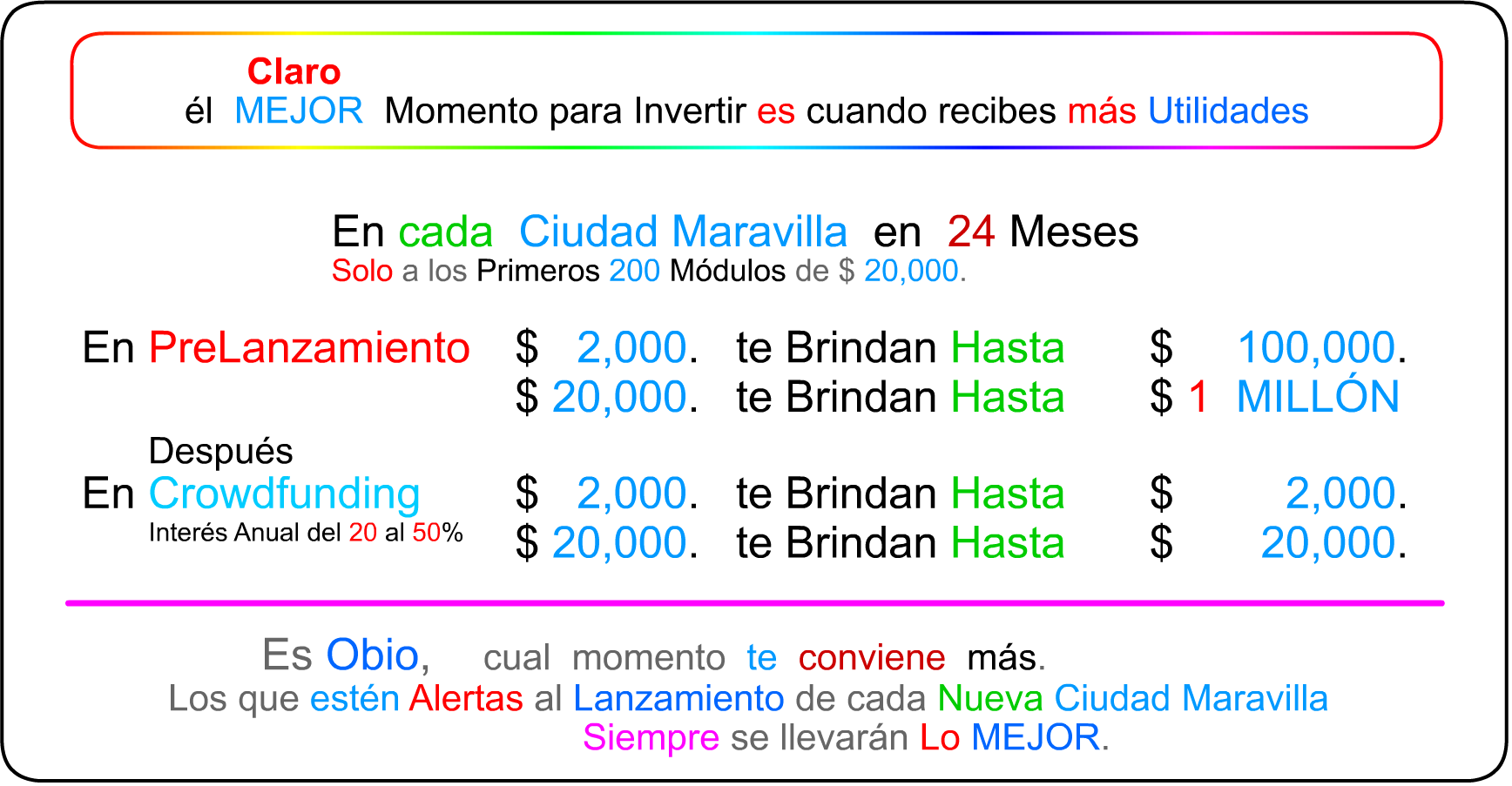 En Ciudad Maravilla superamos estas expectativas al brindar del 20 al 100% anual y en El Pre Lanzamiento hasta el 5000% anual.