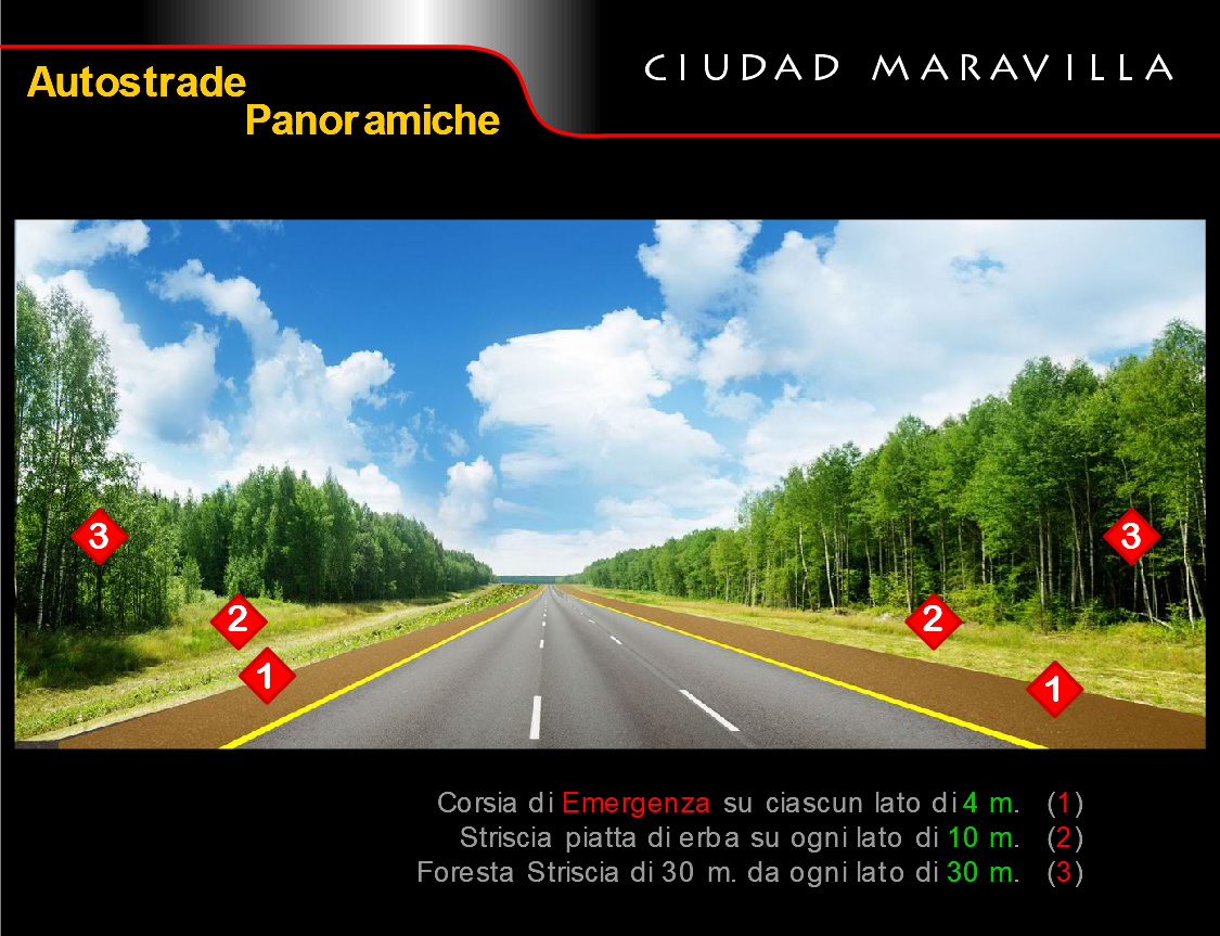 Sulla striscia bianca delle autostrade a senso unico, contano, con 3 corsie ad alta velocità di 4 m. e sul lato destro e sinistro ha una corsia di emergenza di 4 m. (4), lungo tutte le autostrade. Sui Generis (Sì Unico nel suo genere, questa infrastruttura è unica, non esiste in nessuna città del pianeta).
