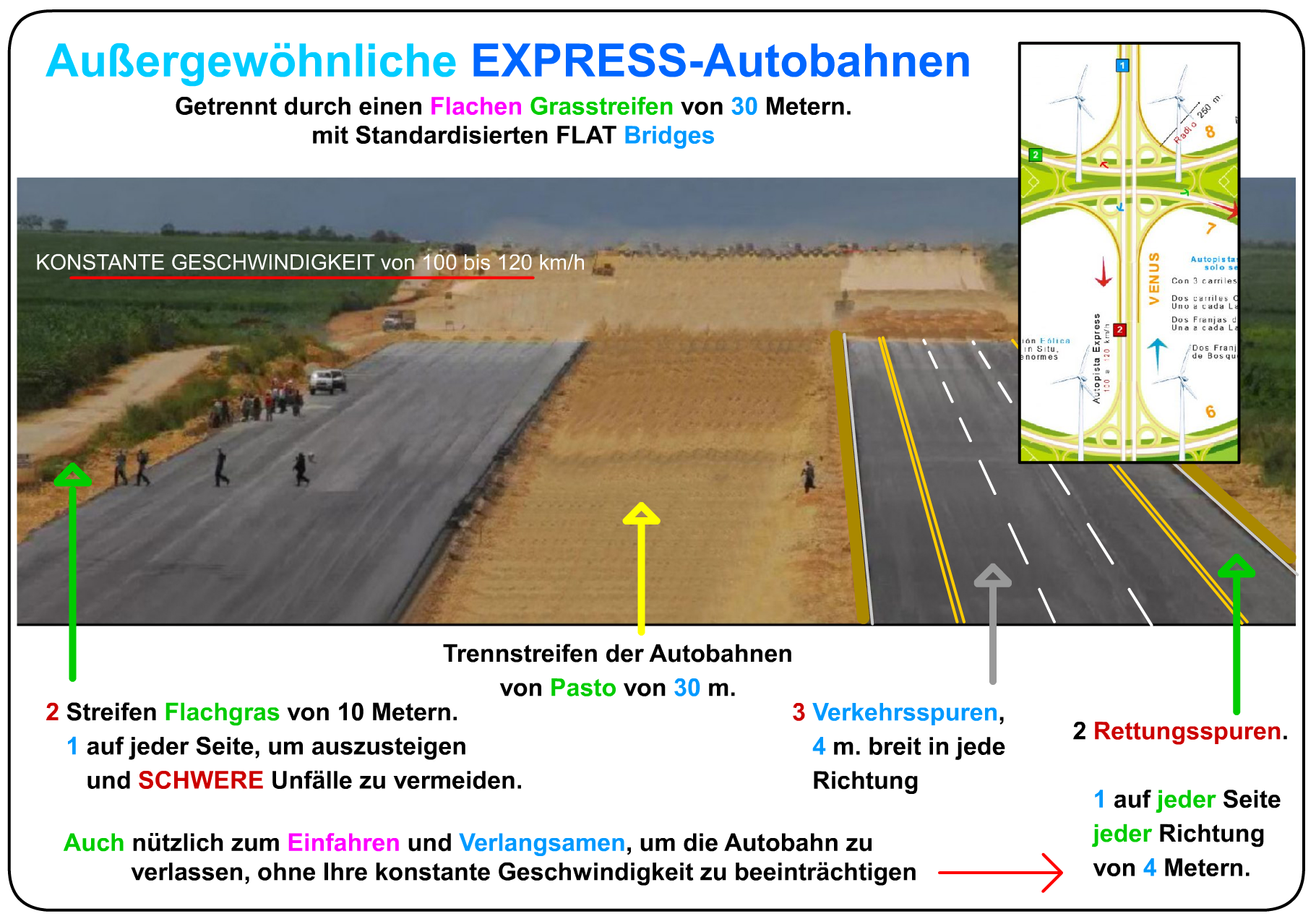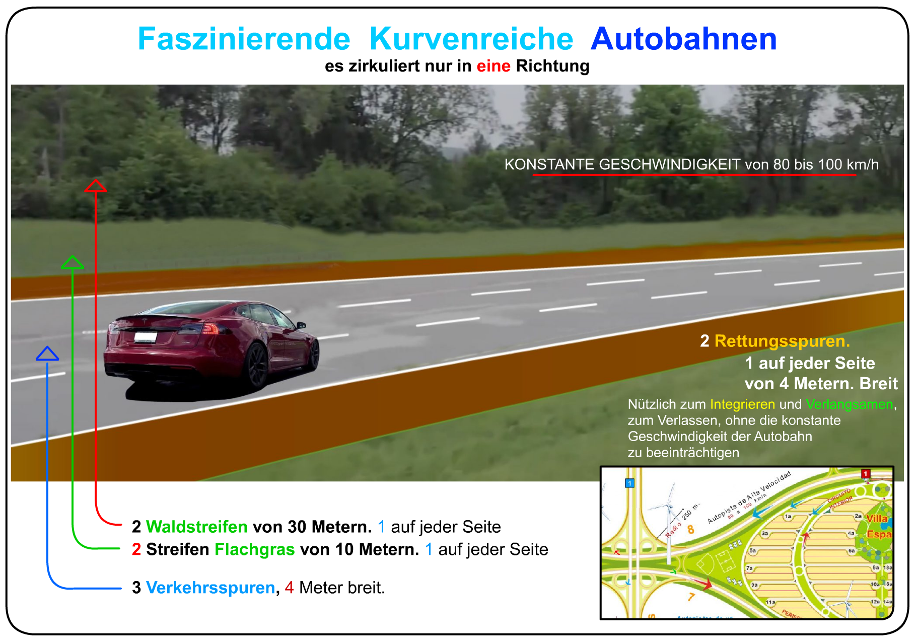 * Spezielle Fahrspuren zur Reduzierung der Ausfahrtgeschwindigkeit und zur INTEGRATION.